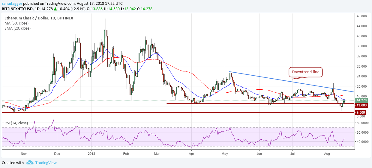 The ETC/USD pair has been holding above the $13 level since April of this year. While the bears broke below this support on August 13, prices have quickly bounced back, after taking support close to the $9.5 mark.