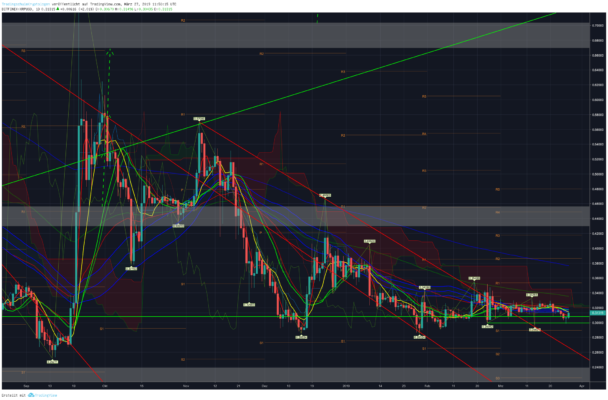 Die 0,31-US-Dollar-Marke fällt. Das Verlaufstief bei 0,29 US-Dollar wird unterschritten. Der Unterstützungsbereich zwischen 0,21 und 0,24 US-Dollar wird getestet. Darunter liegt dann das Abwärtsziel bei 0,15 US-Dollar.