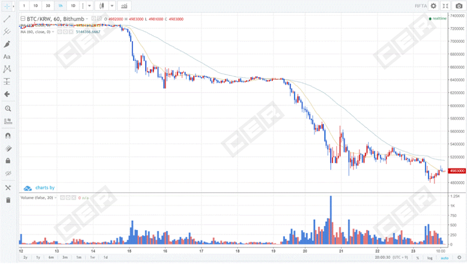 This trend would be repeated daily for the next 30 or more days. In the particular example shown above, 39% of the day’s trades were conducted in that five minute period for a total of more than 34,000 BTC, which accounts for nearly all of the volume reported by Bithumb that day.
