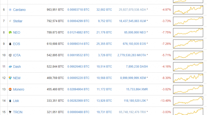 Every top 20 cryptocurrency in the global market has recorded a loss against bitcoin in the past 24 hours, with Ethereum’s native cryptocurrency Ether demonstrating a 5 percent loss, Litecoin recording a 7 percent loss, and NEO recording nearly an 8 percent loss against bitcoin.