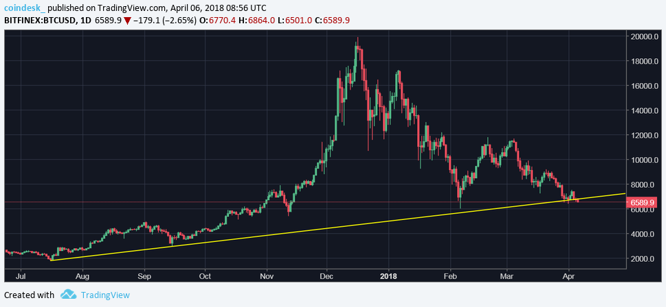 As of writing, the cryptocurrency is changing hands at $6,565 on Bitfinex – down 3.9 percent from Thursday’s close (as per UTC) of $6,769.