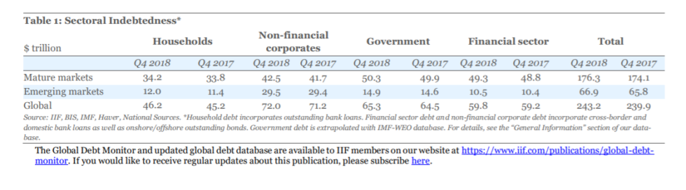 In its of April 2, 2019, the FII details how each sector has contributed to the global debt in the table below: