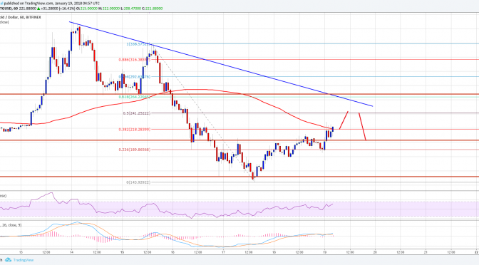 At the moment, the price is testing a key resistance at $218-220 and the 100 hourly simple moving average. The $218 level is also the 38.2% Fib retracement level of the last decline from the $340 swing high to $143 low. Above the $220 level, there is a major bearish trend line forming with resistance at $250 on the hourly chart of BTG/USD. The trend line resistance around $250 is the most important barrier for . An intermediate resistance is around the 50% Fib retracement level of the last decline from the $340 swing high to $143 low at $241.