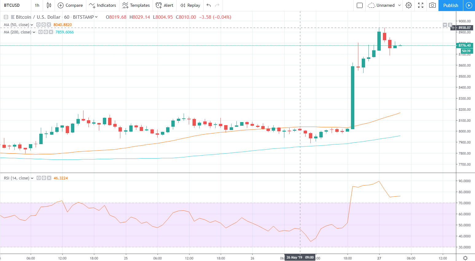 bitcoin (BTC) recorded a high of $8,938 for bitcoin a couple of hours ago. BTC price 00 has not been at this price since early May 2018 according to the trading website.
