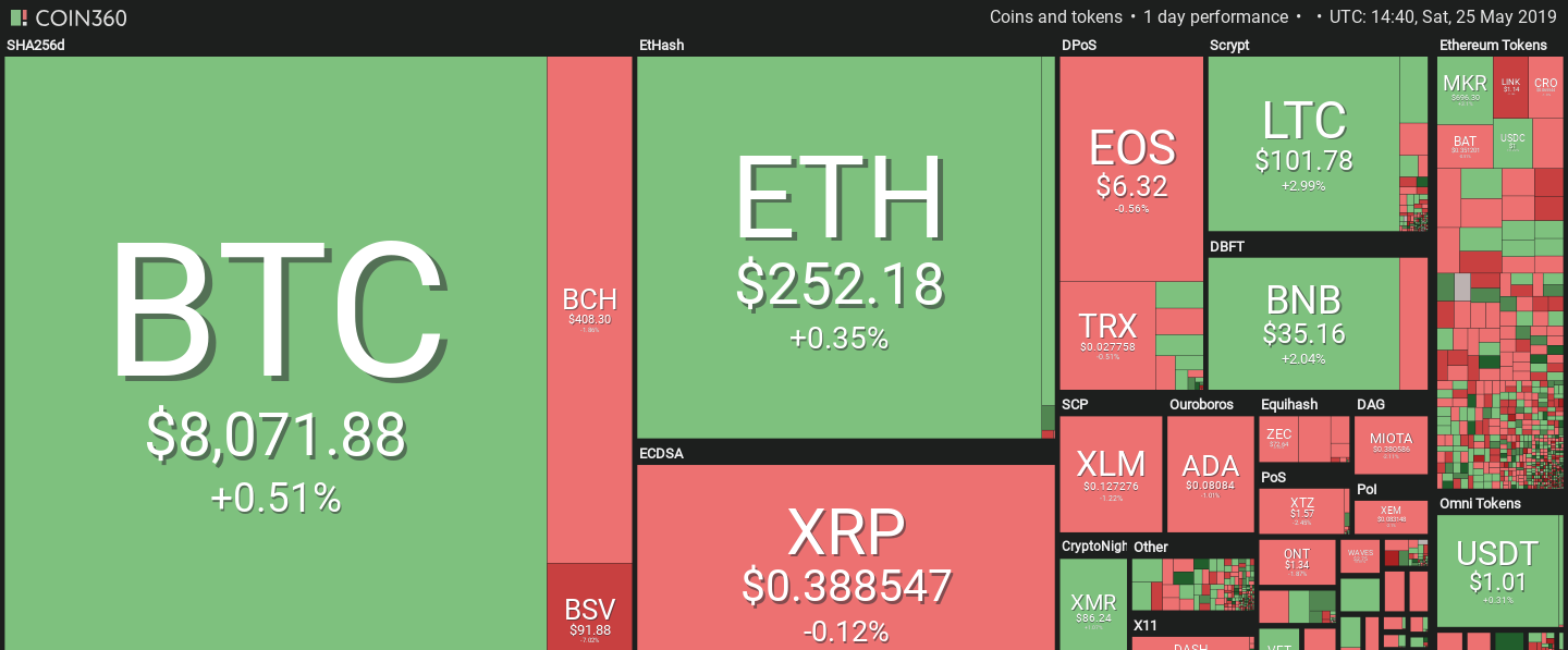 Saturday, May 25 — most of the top 20 are reporting moderate losses on the day by press time, as () still holds over the $8,000 mark, with minor gains on the day.
