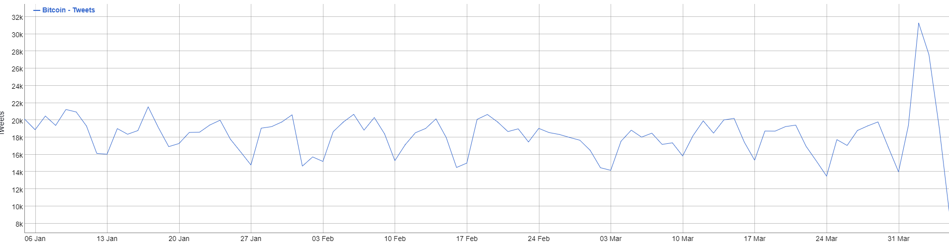 shows that the number of tweets sent per day with the word “bitcoin” also spiked following the price surge.