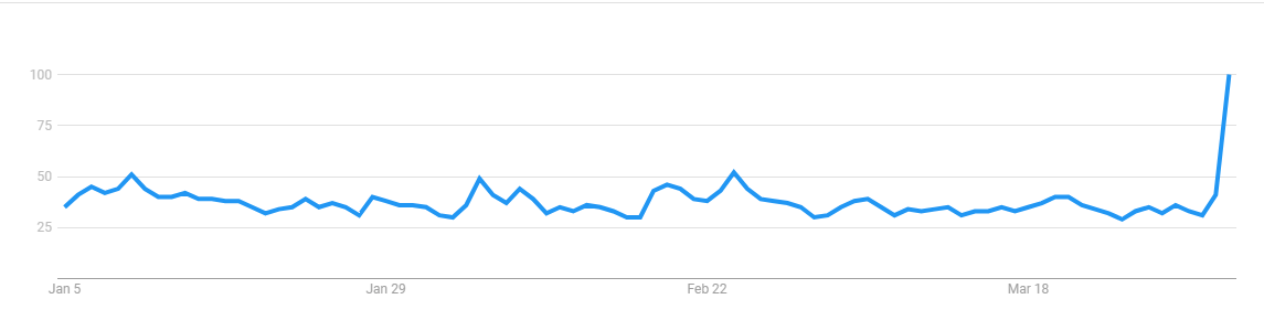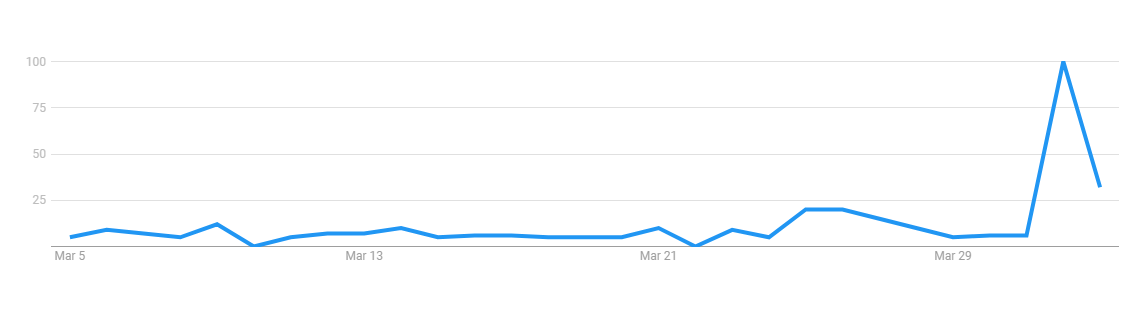 The following Google Trends search analysis shows a massive spike in bitcoin searches in recent days. bitcoin searches more than tripled from 31 to 100 since March 31.
