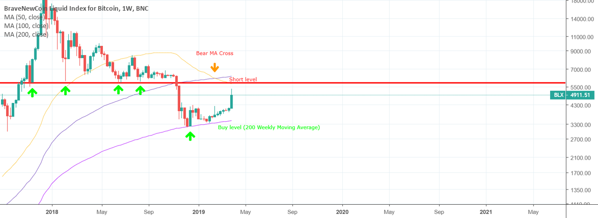 We have seen that the 5800$ level acted as a good support until it was tested for the 5th time in november 2018. Now it is acting as huge resistance and it coincides with the 50 Weekly Moving Average, which also acts a resistance. Furthermore we have seen the MA cross happen already (50 crossed down the 100). The long term support is at the 200 weekly Moving Average.
