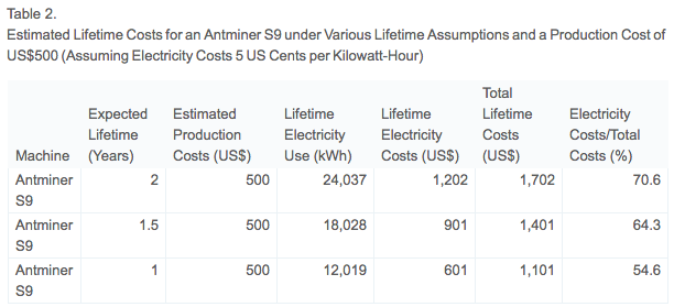 The scientific study goes into detail about the different types of bitcoin miners and their individual energy usage, noting that “trying to measure the electricity consumed by the bitcoin mining machines producing all those hash calculations remains a challenge to date.” De Vries uses as his main example to show how much energy each machine uses in its lifetime.