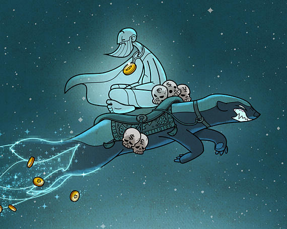 This artwork depicts the spirit of Satoshi Nakamoto hurdling over the moon on his epic honey badger mount carrying trophies of the world's vanquished fiat currencies.