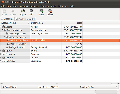 GnuCash treating the bitcoin like a regular currency.