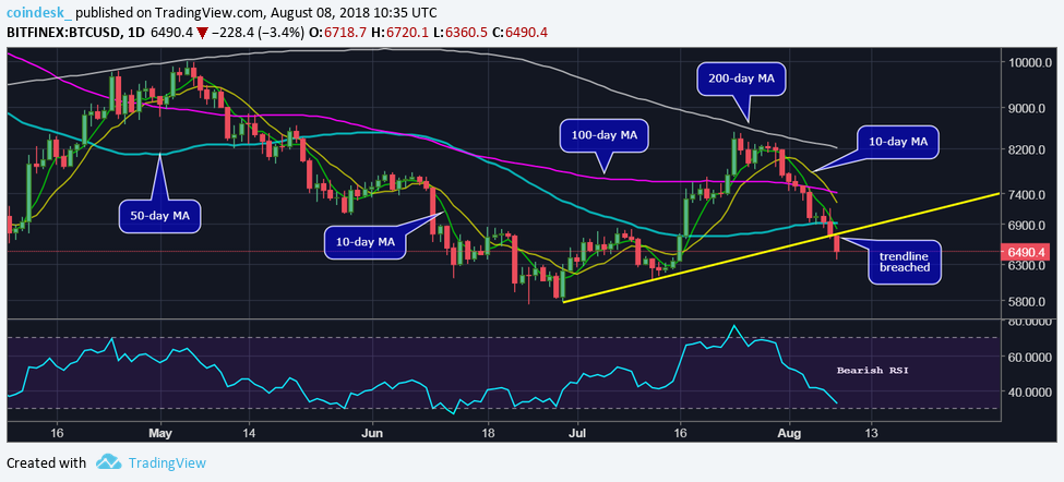 - BTC’s drop to three-week lows below $6,400 has likely strengthened the bear grip and opened the doors to $6,000 (psychological support).