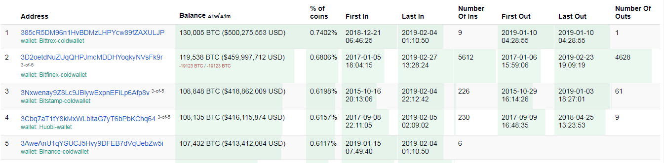 According to data obtained from BitInfo charts, the largest bitcoin wallets are exchange-owned. The richest bitcoin wallet belongs to Bittrex, followed by Bitfinex, Bitstamp, Huobi and Binance. The balance in these wallets in December 2018 was cumulatively 571,079 BTC. However, over the last two months, their cumulative balance grew massively by 2,879 BTC, which is worth over $11.01 million, at press time.