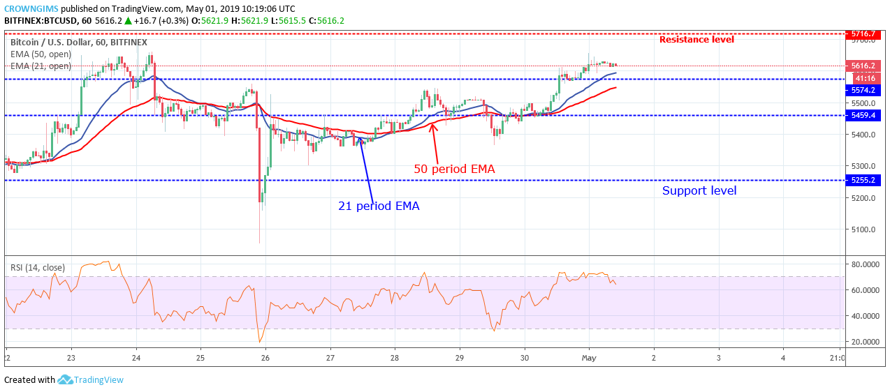 BTC/USD is on the bullish trend on the short-term outlook. bitcoin price bounced at the demand level of $5,459 and the Bullish engulfing candle formed at the same level on April 30. This bullish pressure propelled the BTC price to the north and broke up the $5,574 level. The coin is currently facing the $5,716 price level.