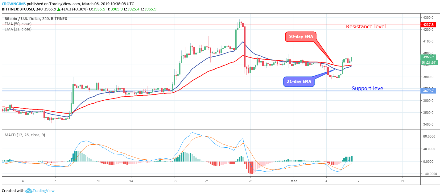 The Cryptocurrency remains on the ranging movement on the medium-term outlook. bitcoin price continues trading within the range of $4,237 resistance and $3, 679 support levels. As at now, the Bulls are making effort to pull out the coin from the consolidation face but the bears are also opposing the movement.