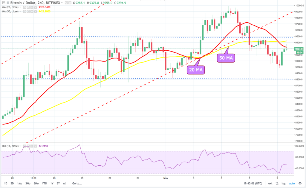 BTC was predominately bullish for most of last week as the cryptocurrency passed through multiple resistance levels only to run out of steam at $9,990. April’s rally brought back memories of the late 2017 cryptocurrency euphoria but hopes have been continuously dashed each time BTC failed to cross the 200-Day MA. The on May 9th bitcoin price sunk to a weekly low below $9,000 as bears broke the support at $9,200 and continued their work on the $9,000 support.