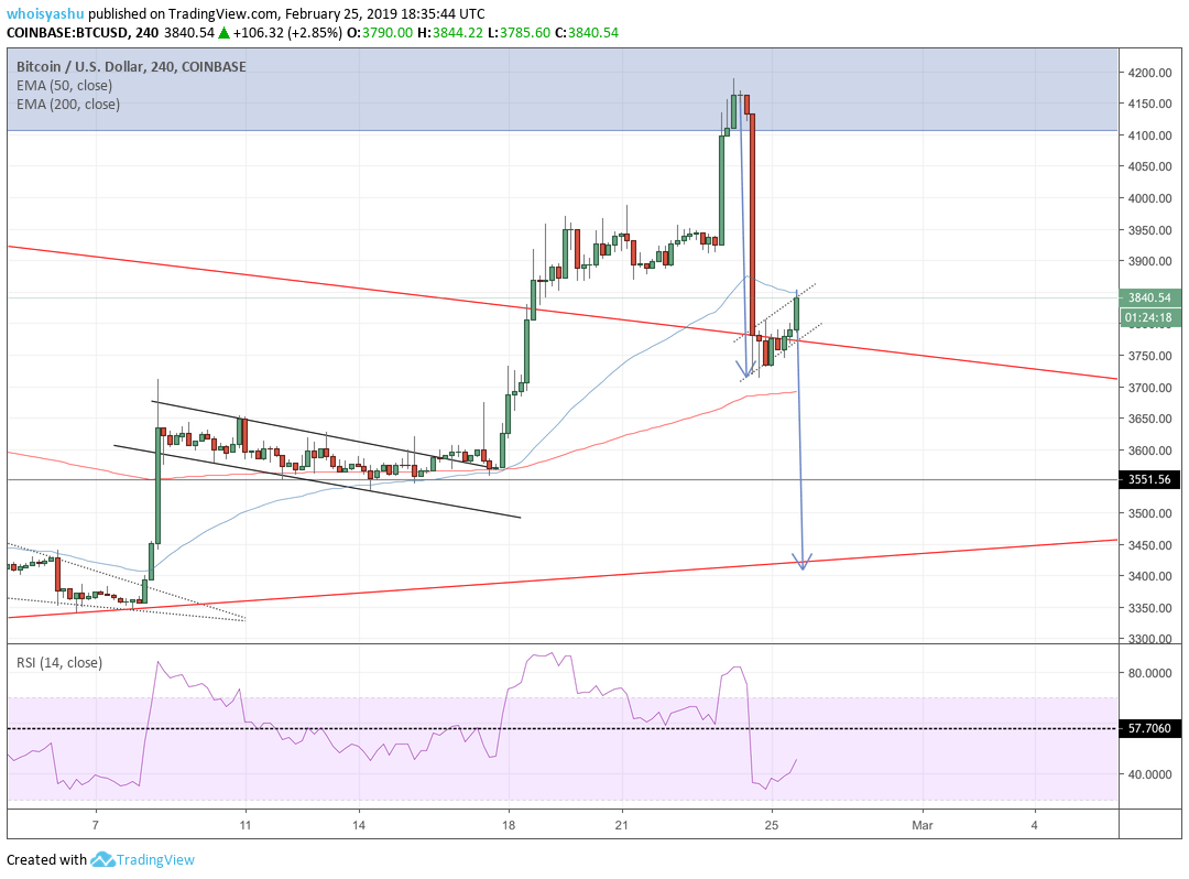 A breakdown action from where bitcoin is right now would be confirmed once the price tests the so-called flag support. At the same time, traders would see a rise in volume. It could pose as an excellent opportunity for short traders, with a potential initial downside target towards $3,551. Adventurous traders could also be eyeing the support trendline of medium-term triangle formation (depicted via a rising red trendline).