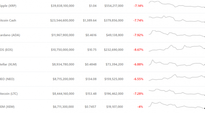 EOS posted a top 10-worst nine percent decline, and Stellar, NEO and Litecoin all experienced seven percent pullbacks.