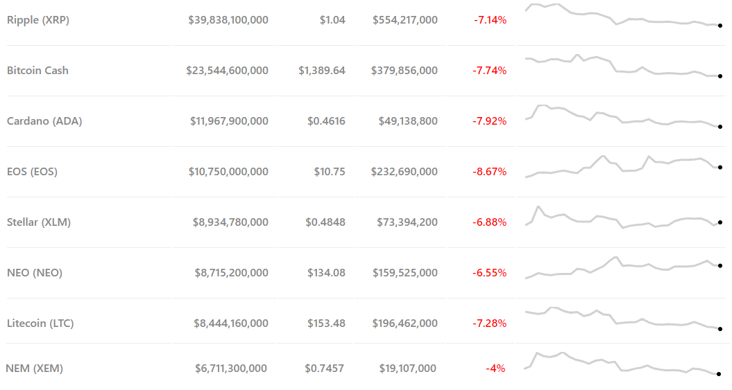 Ripple, which boasts the third-largest market cap, saw its price decline by seven percent to $1.04, while both bitcoin Cash and Cardano endured eight percent hits.