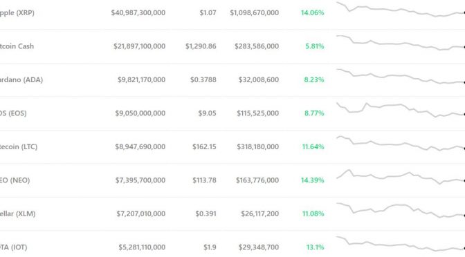 The Ripple price posted a 14 percent gain, which raised the value of XRP to $1.07. Ripple now has a $41 billion market cap, making it nearly twice as large as fourth-ranked bitcoin Cash, which rose just six percent to $1,290.
