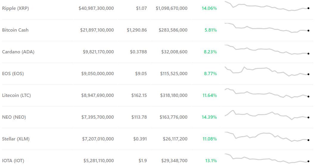 The Ripple price posted a 14 percent gain, which raised the value of XRP to $1.07. Ripple now has a $41 billion market cap, making it nearly twice as large as fourth-ranked bitcoin Cash, which rose just six percent to $1,290.