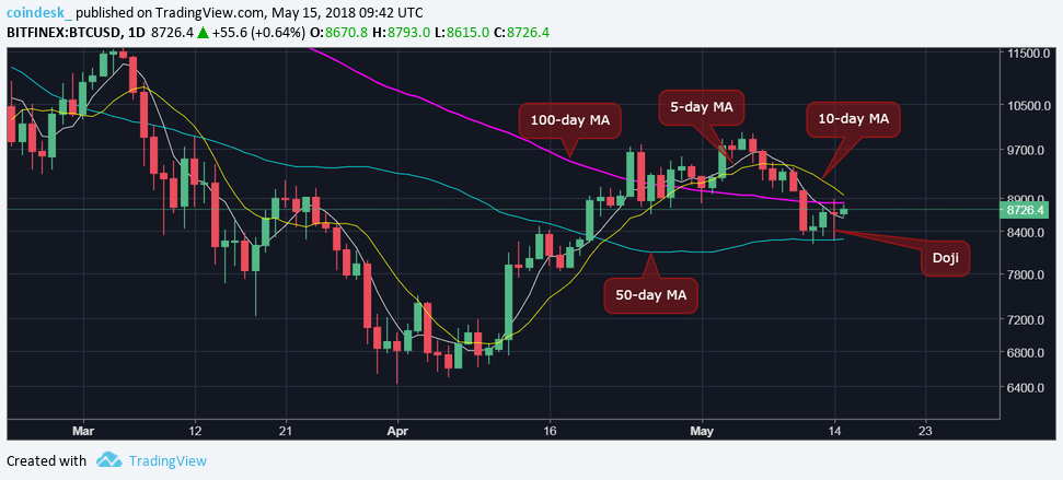 As of writing, BTC is changing hands at $8,760 on Bitfinex, and is trading between the 50-day moving average (MA) at $8,287 and the 100-day moving average at $8,837.