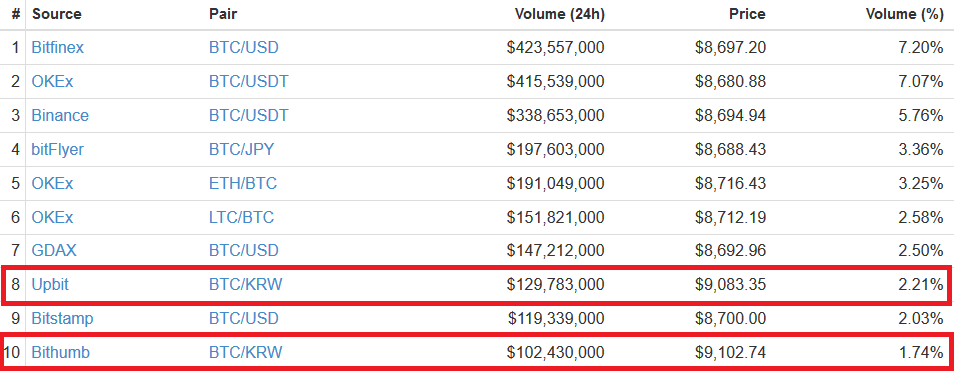 At the time of writing, Seoul-based cryptocurrency exchanges Upbit and Bithumb each priced bitcoin at about $9,100, which represented a roughly five percent premium over the coin’s global average, although these platforms accounted for just a combined four percent of total bitcoin trading volume.
