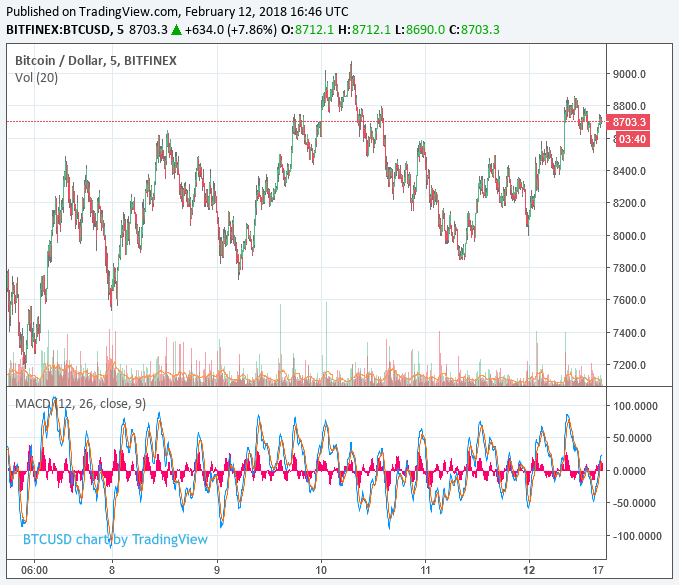 However, bitcoin has thus far been unable to break through resistance at $9,000, albeit for a brief period on Feb. 10. At the time of writing, bitcoin was trading at $8,703 on Bitfinex, which was in line with the coin’s global average.
