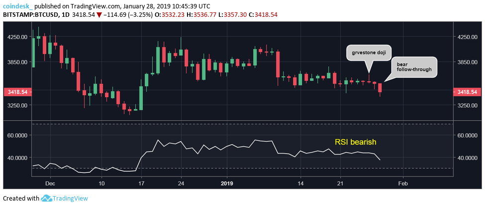 - The drop to December lows could be preceded by a minor bounce to $3,500, as the RSI on the 4-hour and the hourly chart is reporting oversold conditions.