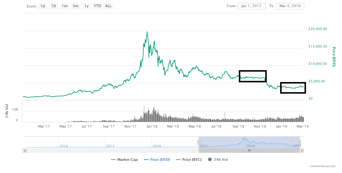 Since January, for over two months, bitcoin has remained in a relatively tight price range from $3,200 to $4,000, unable to break out of key resistance levels above $4,200.