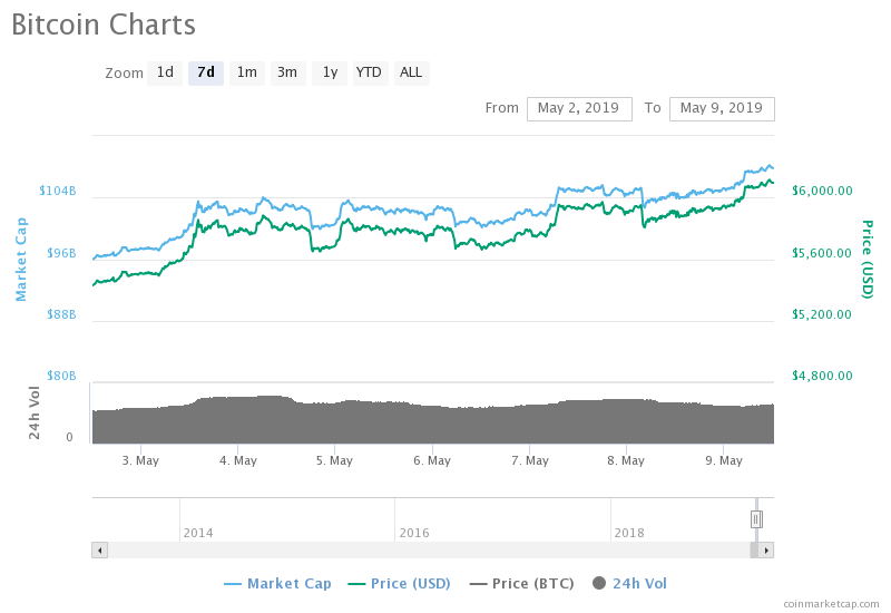bitcoin Price Breaks above $6,000-Resistance | Source: CoinMarketCap.com