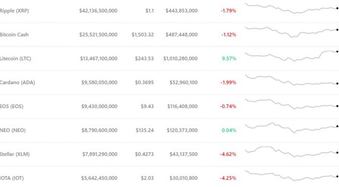 The NEO price held steady at $0.42 for the day, while Stellar and IOTA posted respective declines of five percent and four percent to round out the top 10.