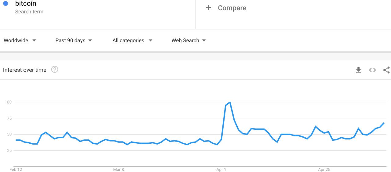Meanwhile, most of the general public is still unaware of the recent surge in bitcoin price. Google Trends data shows that interest in ‘bitcoin’ is only now starting to pick up.