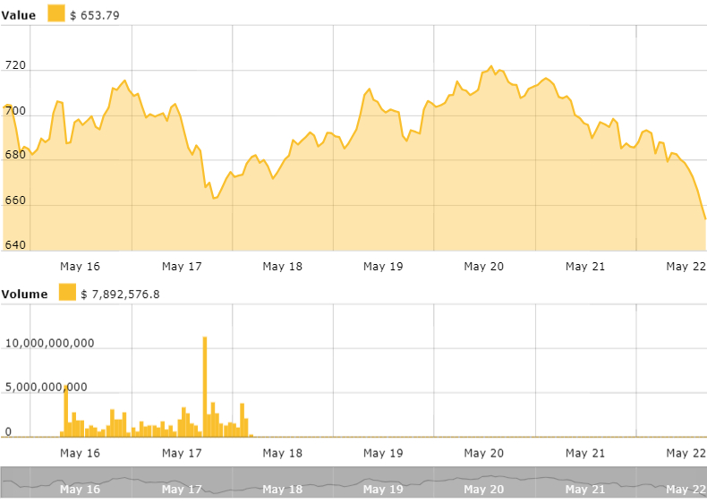(ETH) is is also down, trading at $653.79 down 6 percent over a 24 hour period at press time. Last week, Apple co-founder Steve Wozniak to Apple, saying it, “interests [him] because it can do things and because it's a platform.”