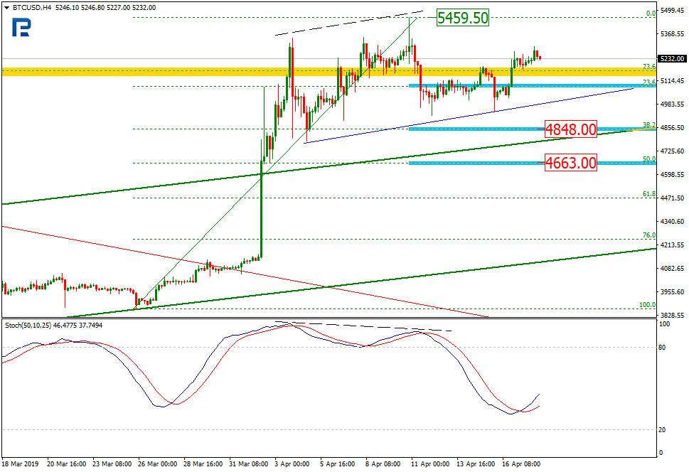 Photo: Roboforex / TradingViewOn H4, one may see the correction after the Stochastic divergence in detail. The downside move reached 23.60% Fibo, and may hit 38.20%, or $4,848, and 50%, or $4,663. The local support breakout will mean the price will most likely head further down.