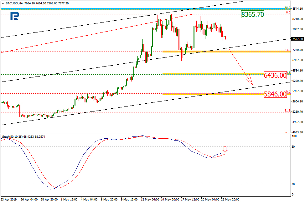 Photo: Roboforex / TradingViewOn D1, one can also see the short term correction going on, with the price ready to make another downward move, probably heading to 38.20% and 50% Fibo, or $6,436 and $5,846, respectively, with the resistance being at $8,365.70.