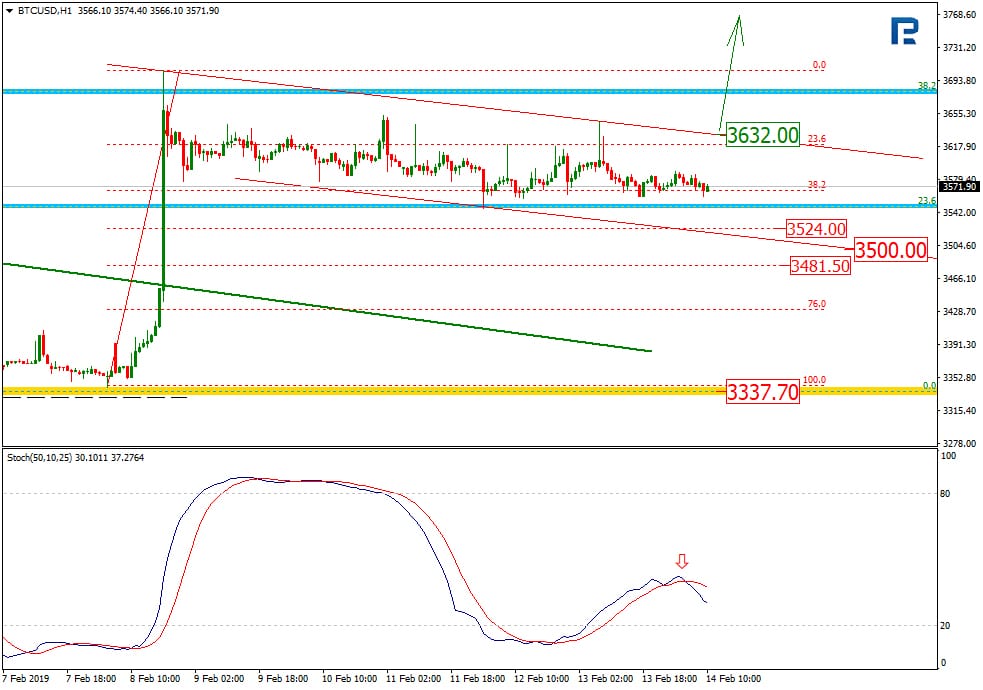 On H1, the major crypto is correcting after the ascending trend reversal. The price reached 38.20% Fibo, after which the market formed a descending channel, which is being developed now. The target may lie around the support at $3,500. After it has been tested, the price may bounce to the local resistance at $3,632; if it get broken out, the BTC may then get to 50 Fibo, or $3,786.