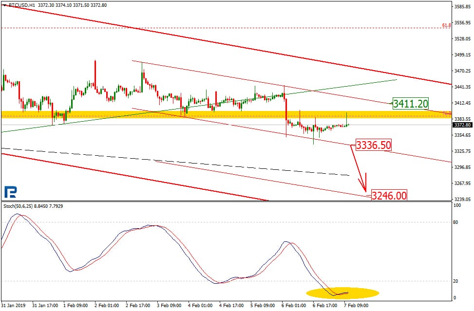 On H1, the crypto is range trading, while the Stochastic is in the oversold territory and signaling a short term pullback to $3,411.20, which is likely to be followed with a new downmove.