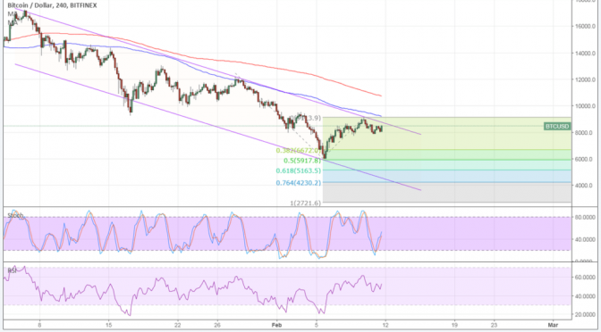 A continuation of the selloff could take it down to the 38.2% extension or to the 61.8% level closer to the channel support and $5,000 mark. Stronger selling pressure could take bitcoin price down to the 76.4% extension at $4,230 or the full extension at $2,271.60.