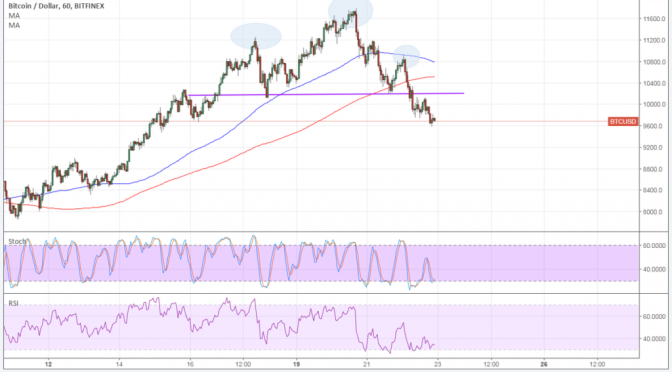 In that case, a pullback to the broken neckline around $10,250 could happen before selling pressure gains more traction.
