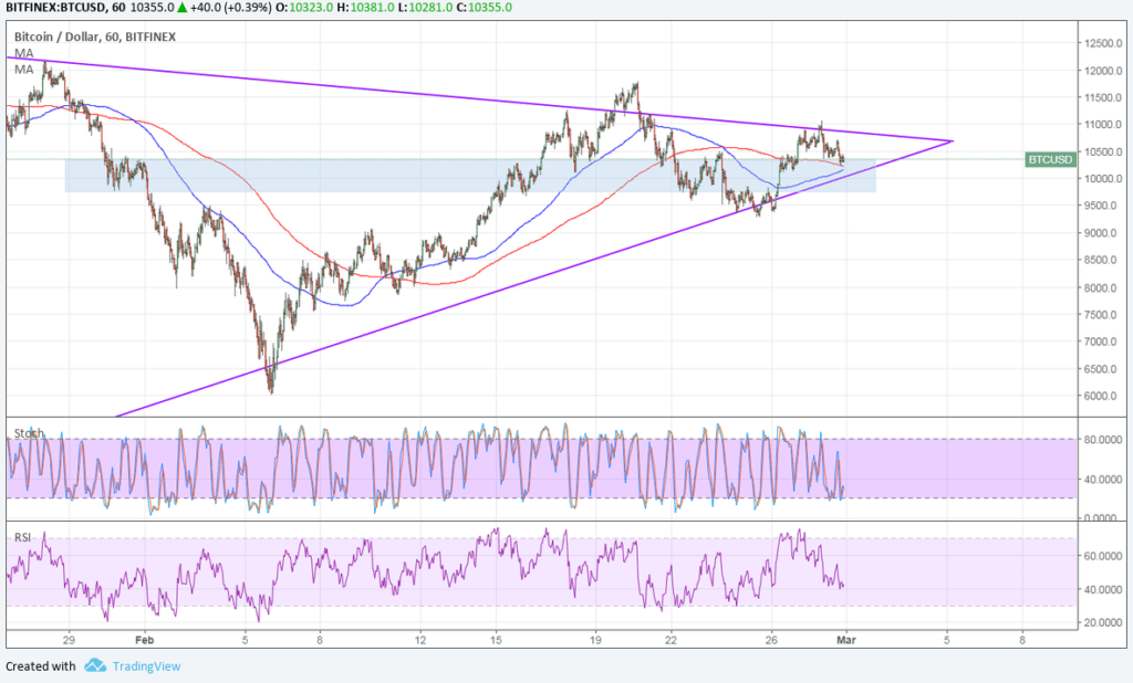 - A bounce could be due as the triangle support lines up with a longer-term area of interest around $10,000.
