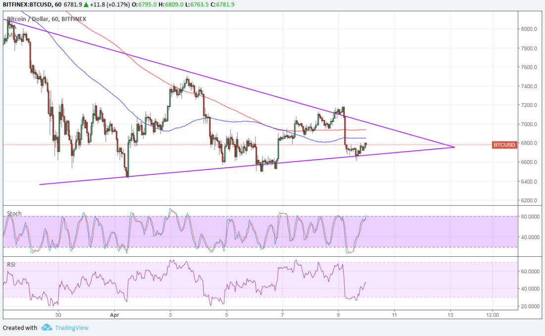 RSI, on the other hand, has plenty of room to climb so bitcoin price could follow suit. A break past the $7000 mark could lead to a rally of around $1500 or the same height as the triangle. Similarly, a break below support around $6700 could lead to a selloff of $1500 in height.
