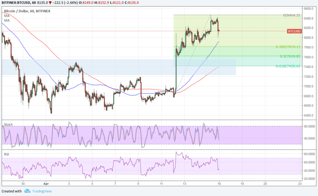 The 100 SMA is slightly above the 38.2% Fibonacci retracement level to add an extra support zone. The 200 SMA is closer to the 61.8% Fib and former resistance zone, making it the line in the sand for a correction. A break below the $7000-7200 region could signal that bears are getting stronger again.