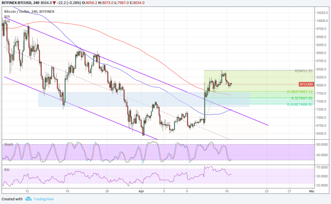 - Price hit resistance at $8450 and is gearing up for a pullback, possibly until the broken resistance.