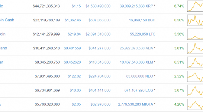 Eighth-ranked NEO rose by three percent to $122, although it was not enough to raise its market cap above the $8 billion mark. The EOS price rose three percent to crack the $10 threshold, and IOTA rounded out the top 10 with a four percent increase to $2.05.