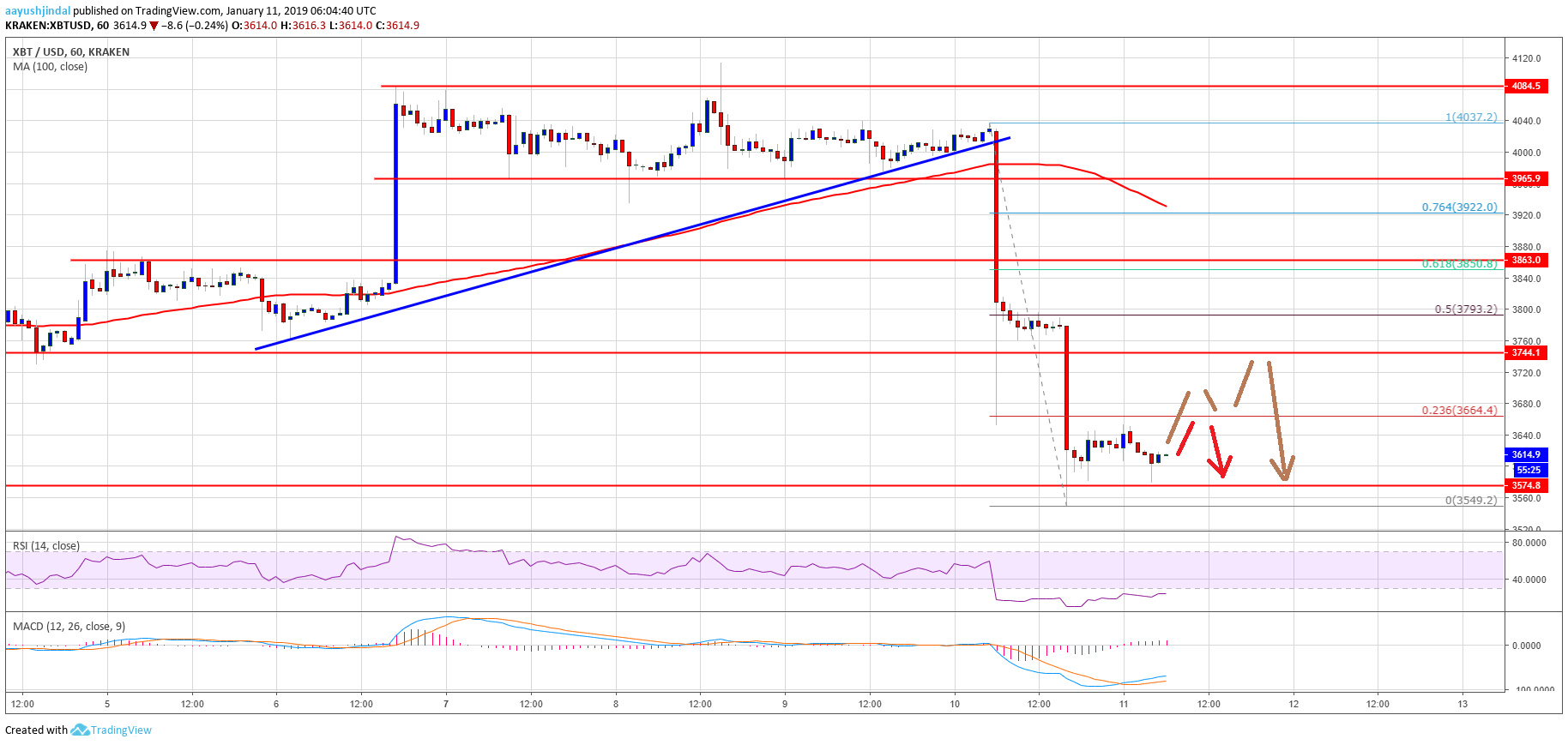 Looking at the , bitcoin BTC [BTC] price is back in a bearish zone below $3,800 and $3,750. If sellers remain in action, there could be a downside break below the $3,550 and $3,540 support levels. On the other hand, a short term correction is likely to face sellers near $3,700 or $3,750.
