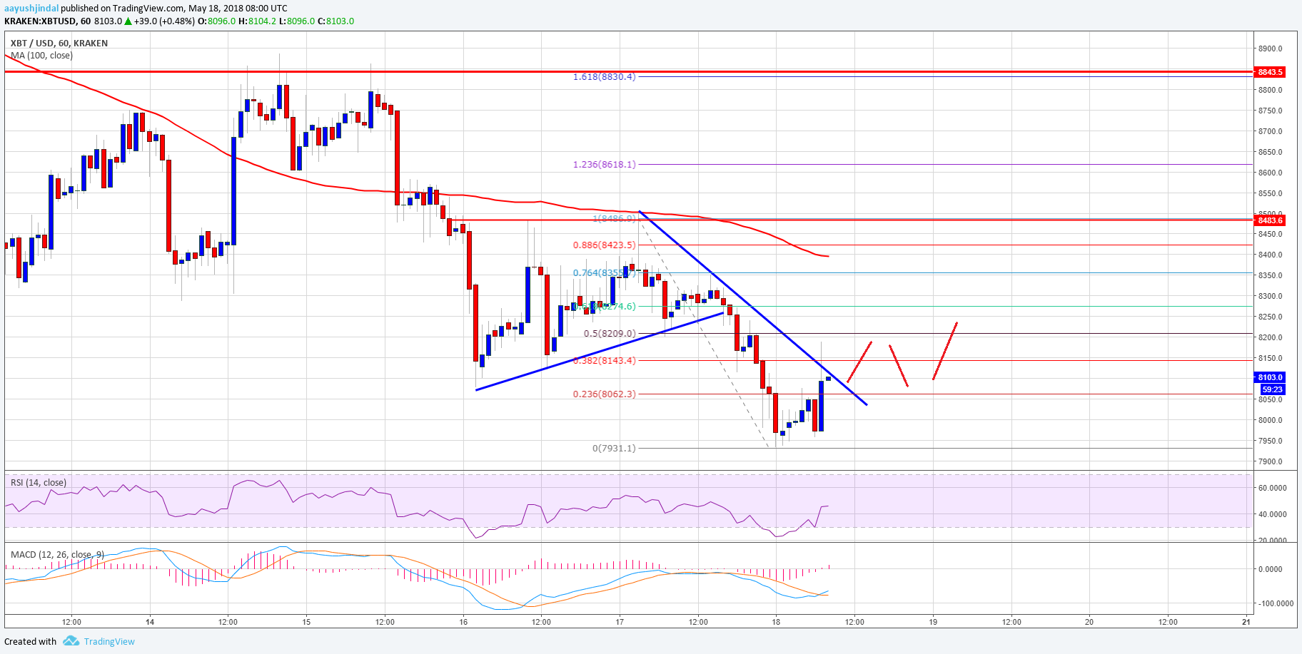 More importantly, there was a break below a triangle pattern with support at $8,250 on the hourly chart of the BTC/USD pair. The pair is now trading well below $8,500 and the 100 hourly simple moving average. The decline was such that the price even spiked below $8,000 and a low was formed at $7,931. At the moment, the price is and moved above the 23.6% Fib retracement level of the drop from the $8,486 high to $7,931 low. However, the price is struggling to move above a connecting bearish trend line with resistance at $8,150.