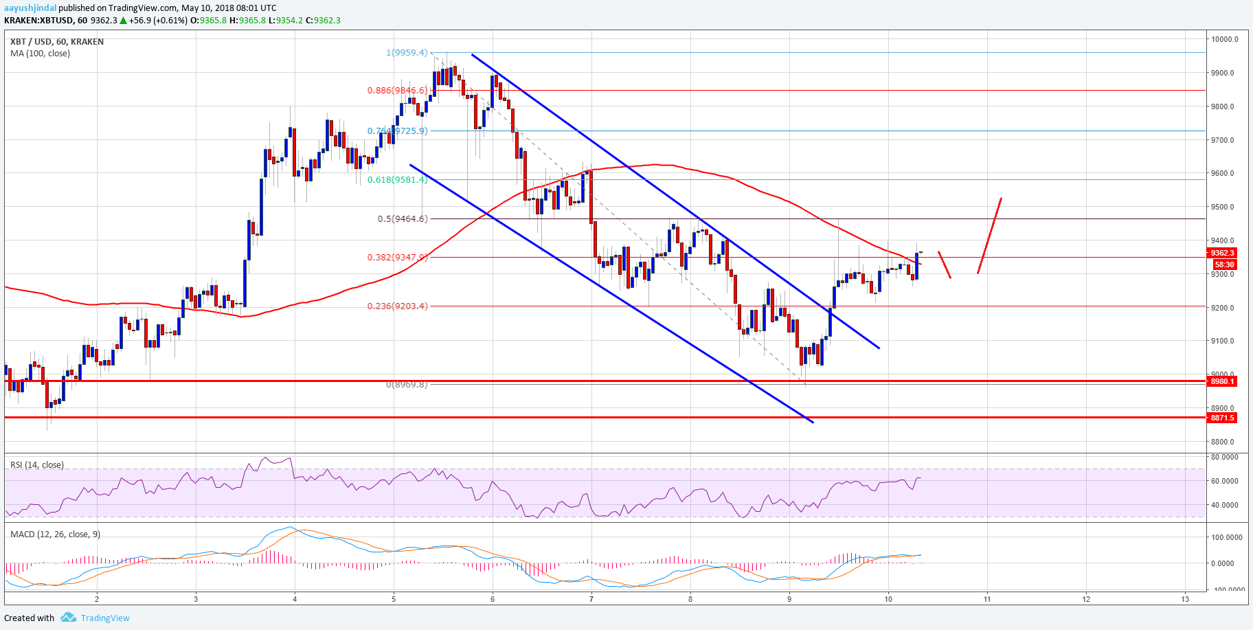 More importantly, there was a break above a crucial declining channel with resistance at $9,200 on the hourly chart of the BTC/USD pair. The pair tested the next major resistance at $9,450 and the 100 hourly simple moving average. It seems like to break the $9,450 resistance since it is the 50% Fib retracement level of the last drop from the $9,959 high to $8,969 low. It is currently consolidating gains near the $9,350 level and the 100 hourly SMA. Once there is a successful close above 100 SMA and $9,450, the price may resume its uptrend.