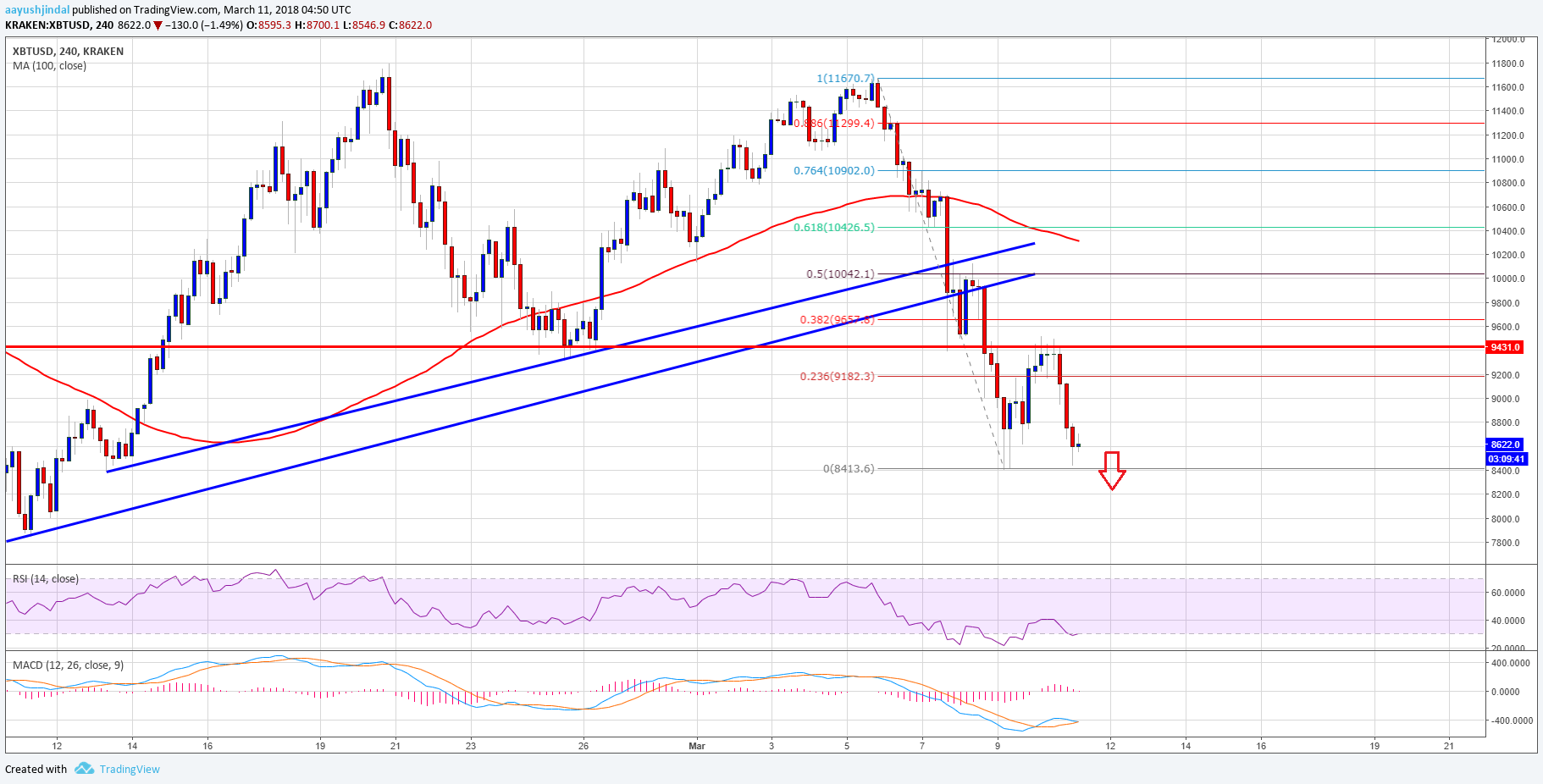 The pair is now trading well below the $9,400 and the 100 simple moving average (4-hours). The recent low was formed at $8,413 from where an upside move was initiated. BTC price traded above the 23.6% Fib retracement level of the last decline from the $11,670 high to $8,413 low. However, the upside move was protected by the $9,400-9,500 levels. The stated $9,400 level was a support earlier and now it is acting as a . The pair resumed its downtrend and it may soon retest the $8,400 level.