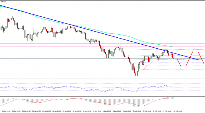 More importantly, there is a crucial bearish trend line forming with current resistance at $8,200 on the 4-hours chart of the BTC/USD pair. The trend line resistance acted as a monster barrier near $8,900 and prevented further gains. The pair is currently correcting lower and it has moved below $8,100. Moreover, the price declined below the 23.6% Fib retracement level of the last wave from the $5,816 low to $8,941 high. It seems like the price towards the $7,400 level.